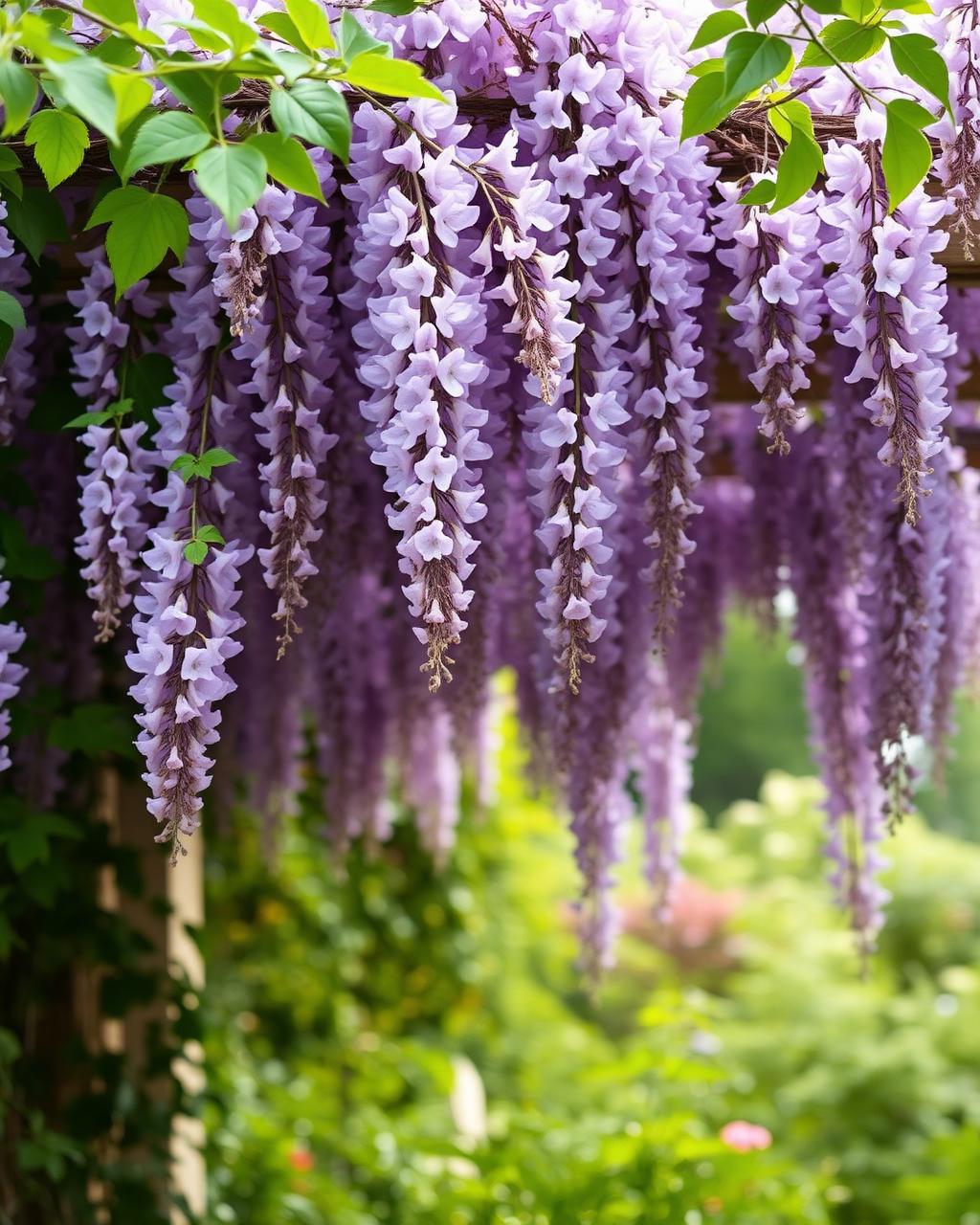 A flower canopy hovers above the vows, all wisteria air and wild petals pausing the world for a breath.