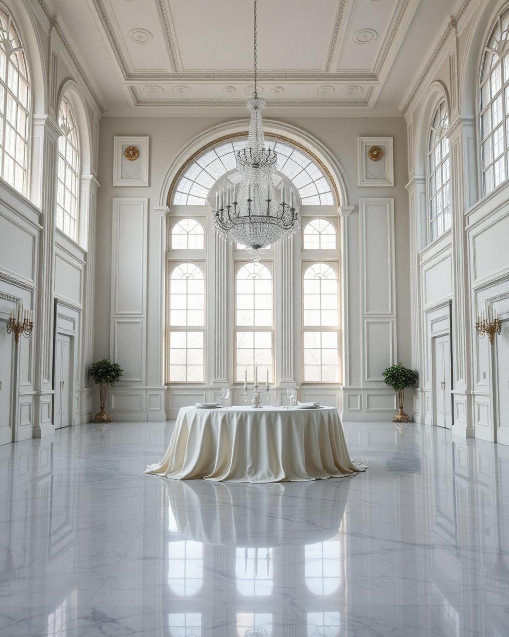 Crystal chandeliers hold the room in soft suspense, scattering candlelight across marble and silk.